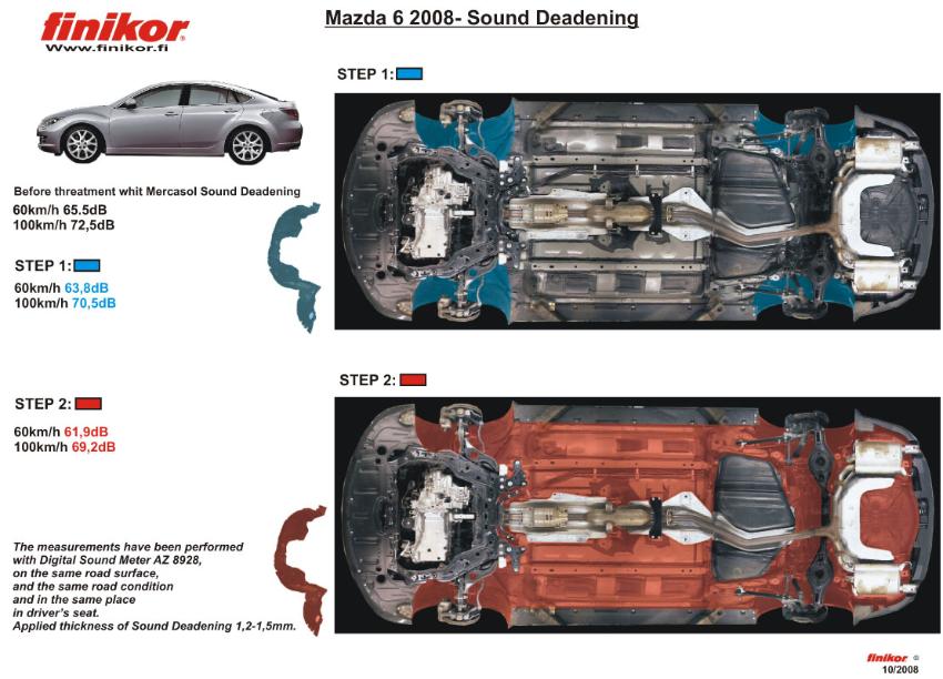 Laaja: Äänieristeaineen ruiskutus alustan valikoituihin kohtiin sekä pyörätiloihin. Lisäksi äänieristemattoa lisätään varapyöränkotelon sisäpuolelle ja takakontin sivuille mahdollisuuksien mukaan. Sisälokasuojat on mahdollista lisätä käsittelyn yhteydessä parantamaan äänieristystä entisestään. Sisälokasuojien saatavuus on mallikohtaista.
